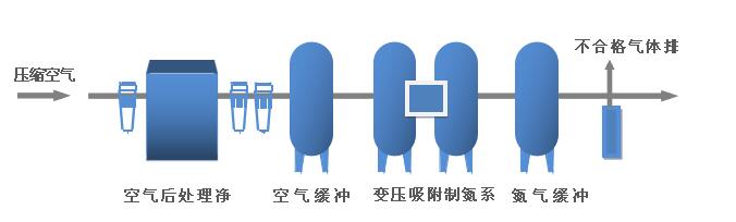【三陽制氮設備主要組件:】空氣后處理凈化系統,空氣緩沖罐,變壓吸附主機系統及氮氣緩沖罐及控制系統組成。